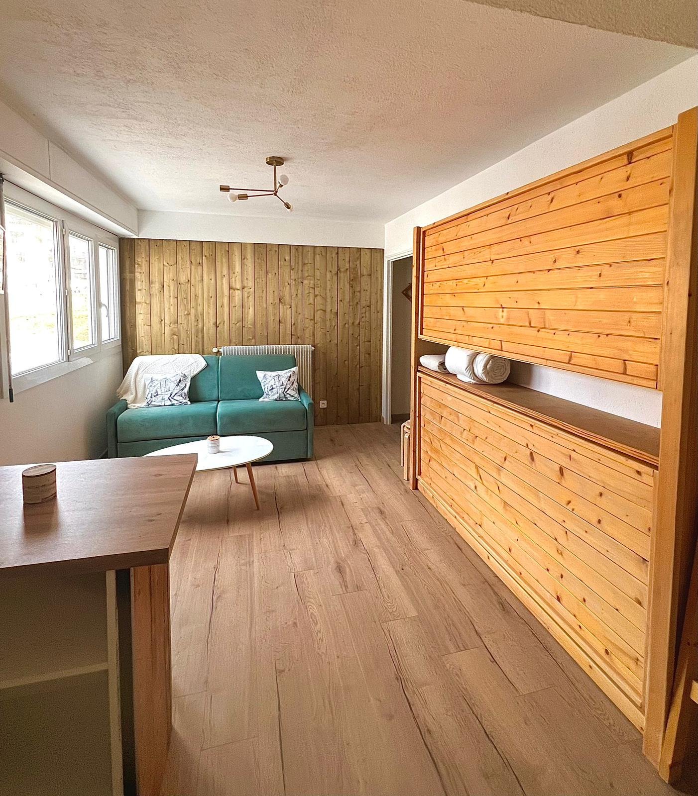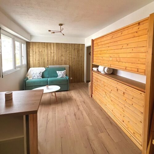 Studio de 22 m² refait à neuf (décembre 2023), situé au 2e étage avec ascenseur, à 5 minutes à pied des remontées mécaniques. Vue dégagée, local à ski, places visiteurs à proximité.